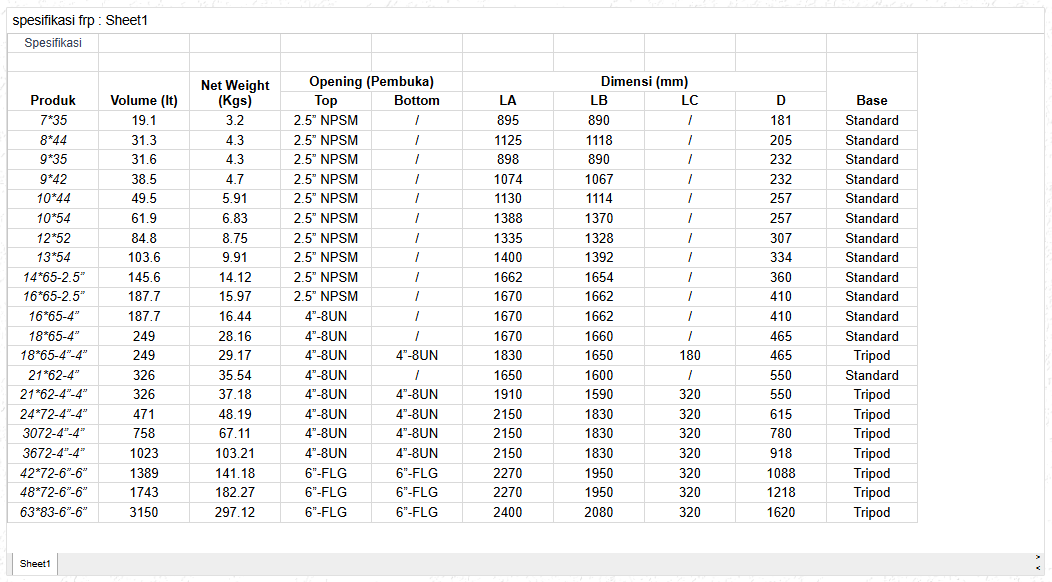 FRP Pressure Tank tersedia dalam berbagai ukuran, mulai dari tangki kecil untuk penggunaan rumah tangga hingga tangki besar untuk aplikasi industri. Ukuran yang umum meliputi: