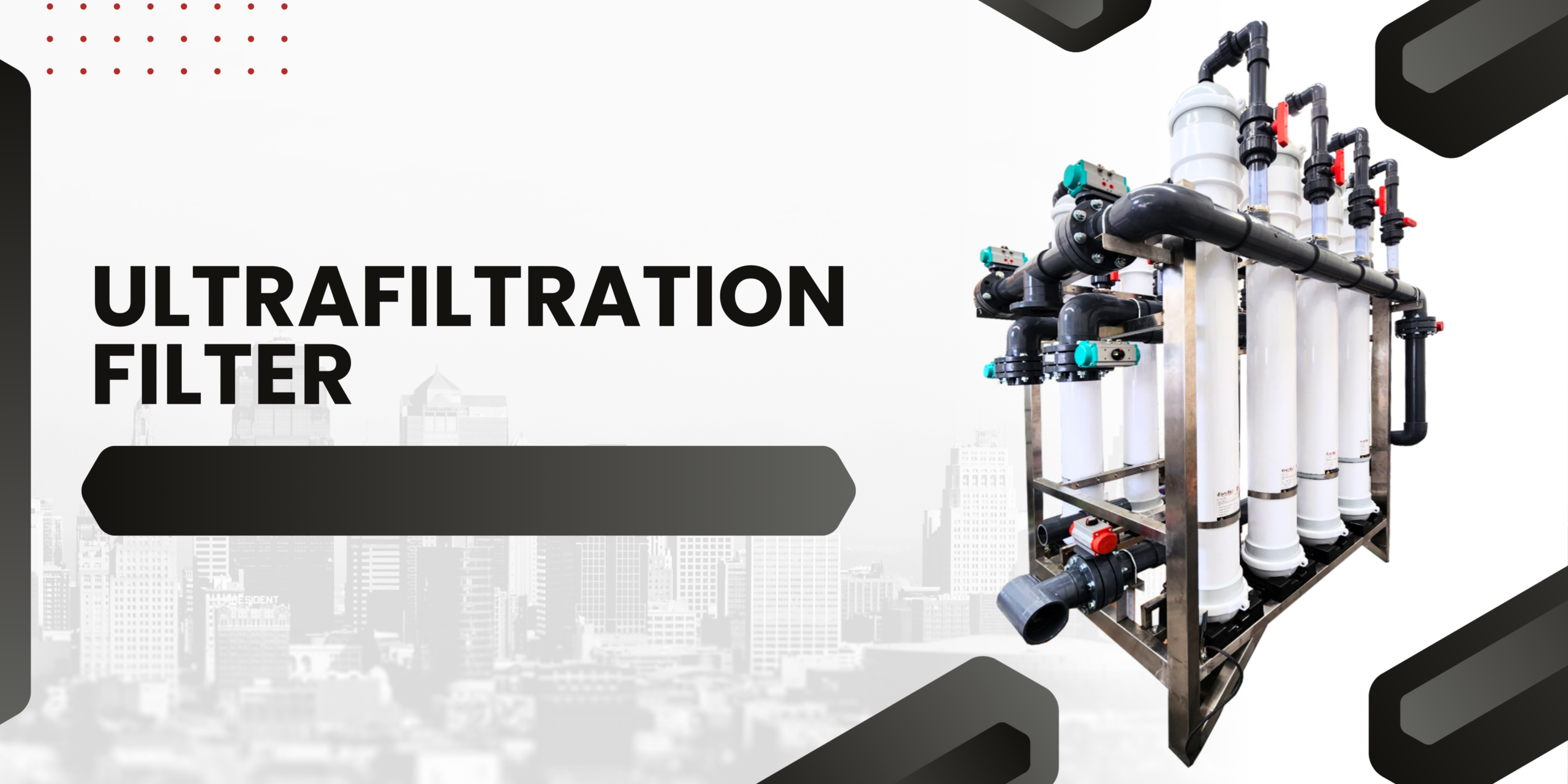 Ultrafiltration filter merupakan proses penyaringan air melalui membran UF dengan ukuran pori < 0,1 mikron, sehingga dapat menghilangkan kekeruhan, partikel, bakteri, zat organik dan kontaminan lainnya termasuk mikroorganisme, bakteri, dan klorin di air sehingga dapat menurunkan angka TSS (Total Suspended Solid) di air.